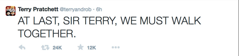 At Last Published March 12, 2015 at 794 × 187 in Terry Pratchett Is Gone, and I Miss Him The last Tweet on Pratchett’s account. Fans will know who is speaking.