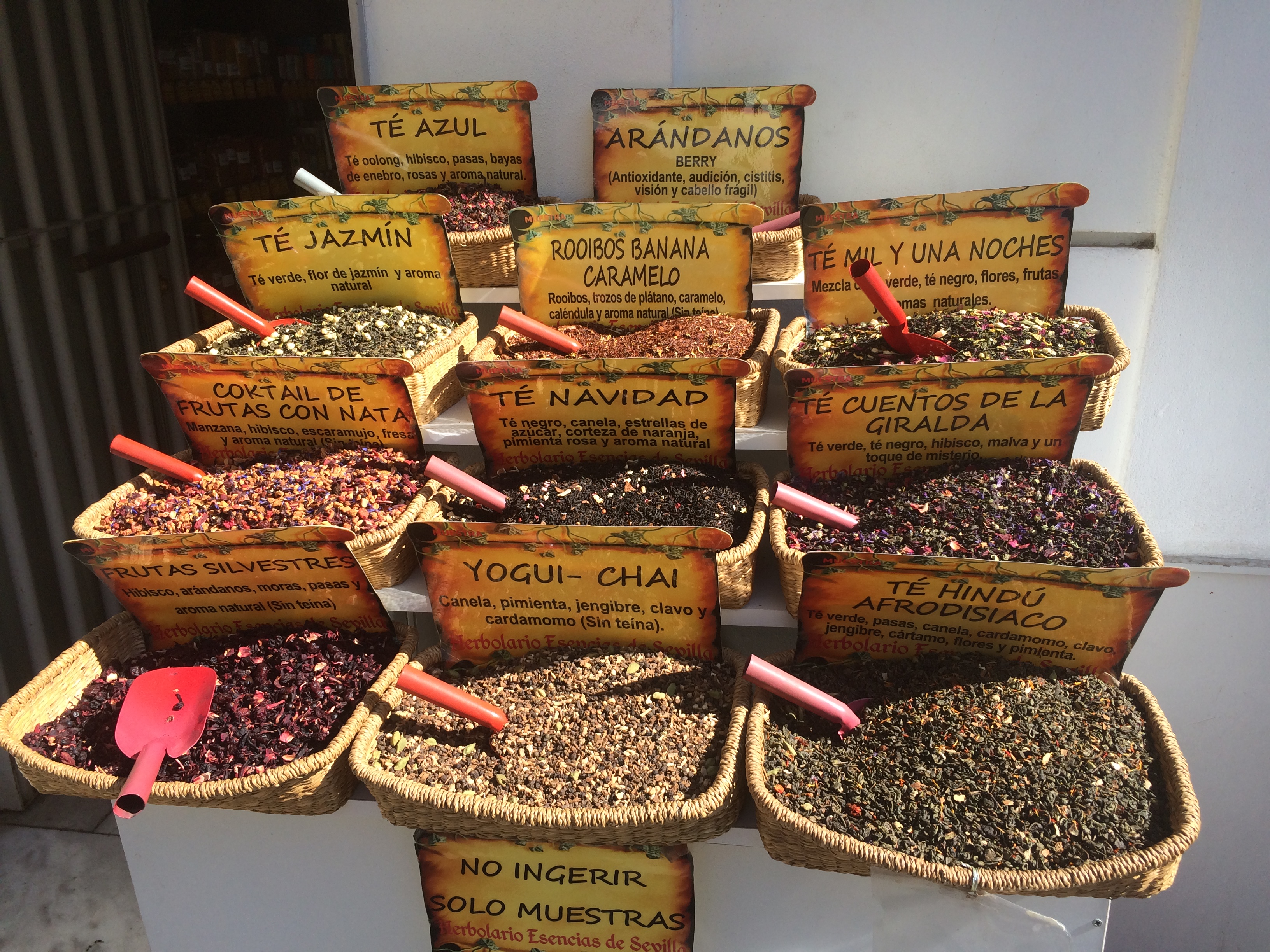 2015-06-15 10.41.24 Published June 16, 2015 at 3264 × 2448 in Walking in Sevilla and Getting Damned Tired of It. (Walking, Not Sevilla.) Outdoor display of teas near the cathedral