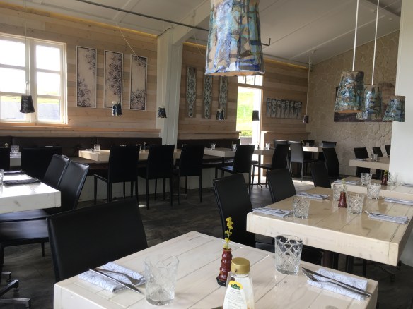 On the drive from Akuréyri, we stopped for lunch at a random guesthouse in the middle of absofucking nowhere. Walking up, we were expecting a plain interior and a choice of salmon sandwich, chicken, and pizza. It was a real surprise. The interior was very Icelandic Modern with blond wood walls, abstract art, and hideous pottery lamp shades that looked like they were your child’s first clay project. It turned out all the plates, vases on the tables, the mugs, etc. had been lovingly created by the same unsteady hand (not thrown or cast), so that nothing sat square on the surface of the table, but wobbled slightly. The menu was presented as a clutch of loose sheets held together by a clipboard, which I suppose made it easy to change the menu quickly. Tom had salmon and I ordered shellfish soup. It was excellent, accompanied by home baked rye bread and butter.