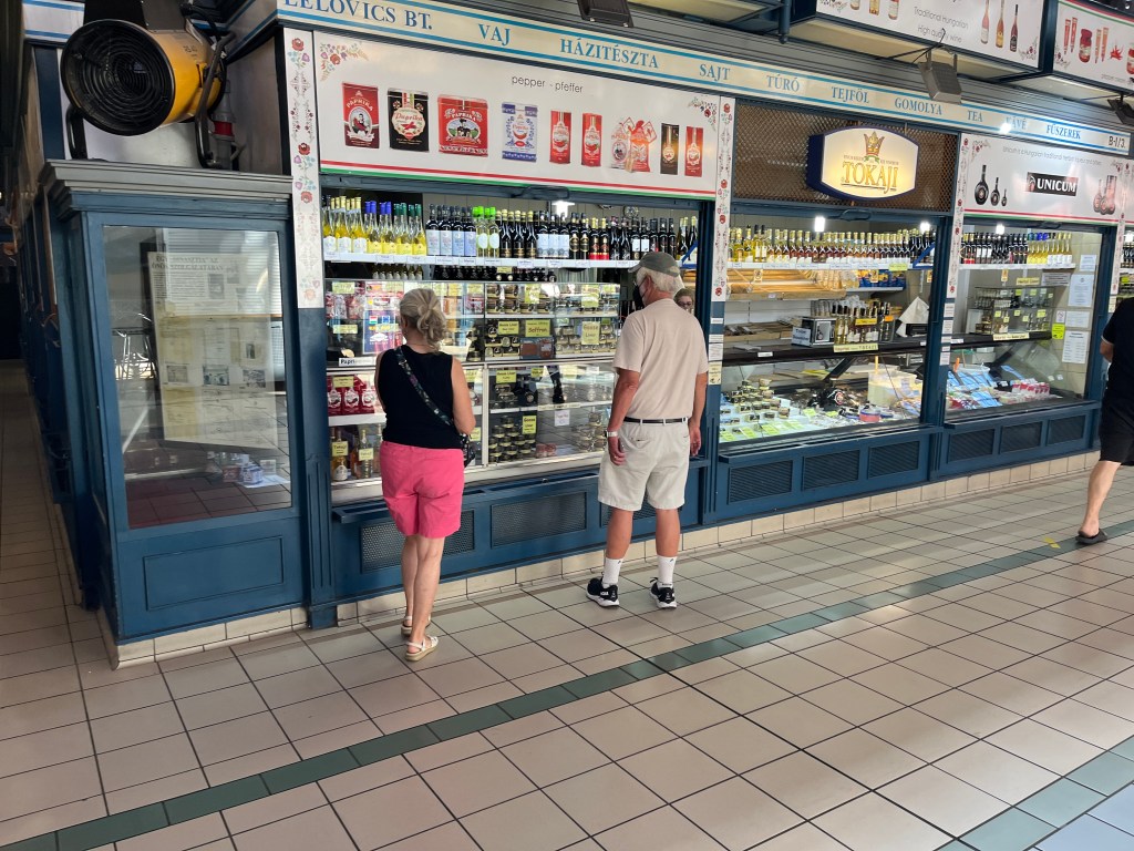 Ex Teri or of the Great Market Hall. It is impossible to get a photo of the entire, enormous building.First floor of the Great Market Hall.Tom and Linda at a wine stall in the Hall. Linda was looking for a Hungarian varietal called Tokaji, known as Tokay in English. You buy it according to its sweetness rating, from 1 to 10.