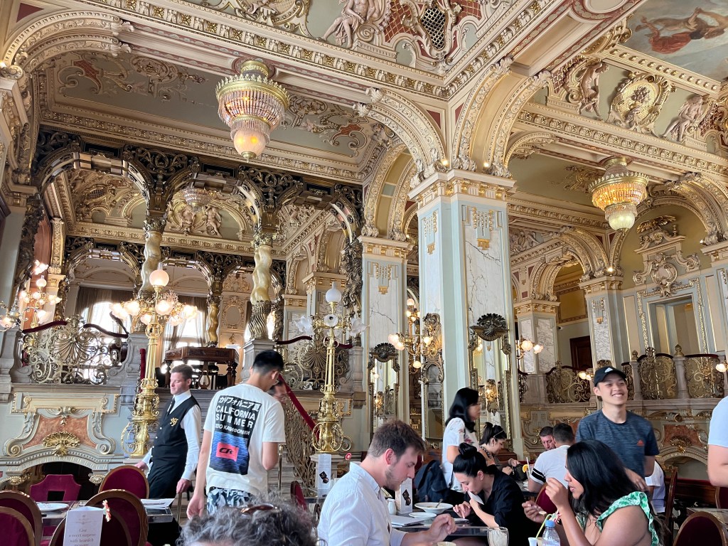 Susan, David, Tom, and I went to the New York Cafe for lunch, which was delicious, but it could hardly compete with the decor, which was as much over the top as any palace. It’s also the size of a small palace. There was also live music, an excellent violinist and pianist playing classical music. A lovely experience.