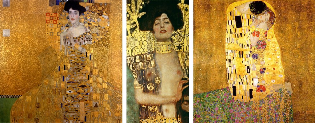 A few Klimt paintings: left to right “Woman in Gold,” “ “Judith,” and “The Kiss.” I find “Judith” fascinating. Her face is not the face of a woman who has just decapitated her enemy (Holofernes’ head appears as something of an afterthought at the lower right). She looks like a woman who just had the best orgasm of her life.