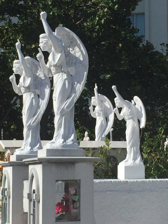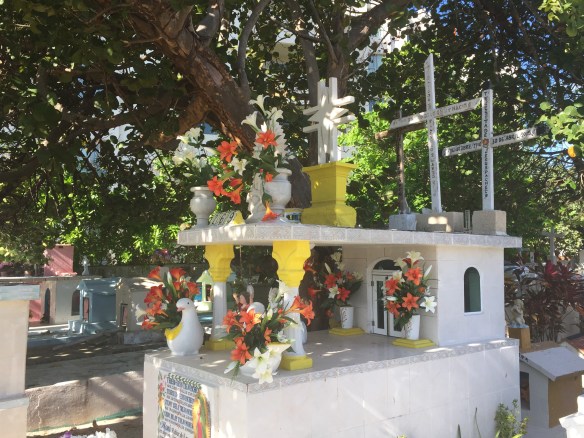 Most of the tombs in the Isla Mujeres graveyard were designed like little two-story houses. The top story was often enclosed by glass and protected with miniature wrought-iron grills like most Mexican houses. These enclosures were often locked with padlocks, though in some cases the closure was a simple wooden latch. Inside were offerings of liquor, plastic and real flowers, little Madonna statues and angels, candles, and other things. One fancy tomb had an entire bottle of sparkling wine. Many of the structures are electrified–I’d like to see it at night. The monuments come in all sorts of designs. While most looked like little houses, one looked like a Roman temple, and there were many other variations. No two were alike, although there were several identical angel statues, each holding an index finger to her lips, the other index finger pointed heavenwards. It had the effect of a bunch of very bossy librarians.