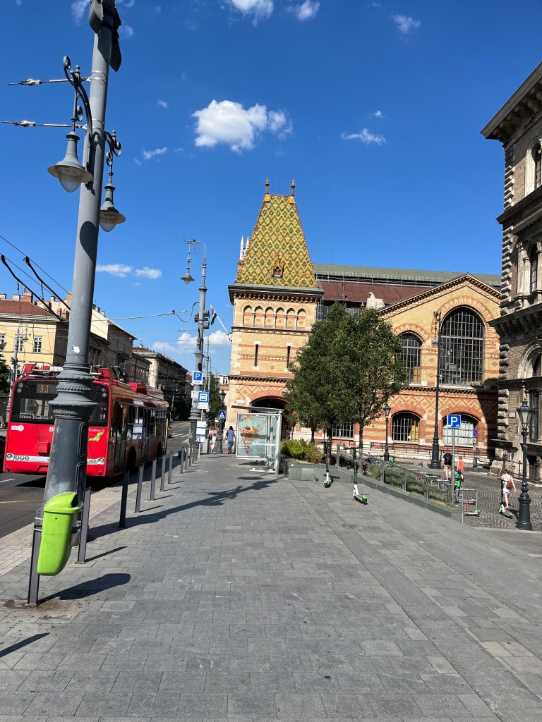 The others took off walking in the heat to see the Grand Market Hall. I took the bus to a drop-off point just the other side of the Danube from the hall and walked across on a bridge. I arrived shortly after they did, but the hall was closed (it was Sunday). It is a gigantic building of many floors. The exterior is beautiful, with colored tile roofs. Linda and Clod had gone back to the hotel because of the heat. We went across the street to an outdoor cafe that had misters—what a great idea!—and got cold drinks. Then we walked down a street that had lots of cute shops and outdoor eateries, and was blocked to traffic. I knew Linda would enjoy it if we came back.