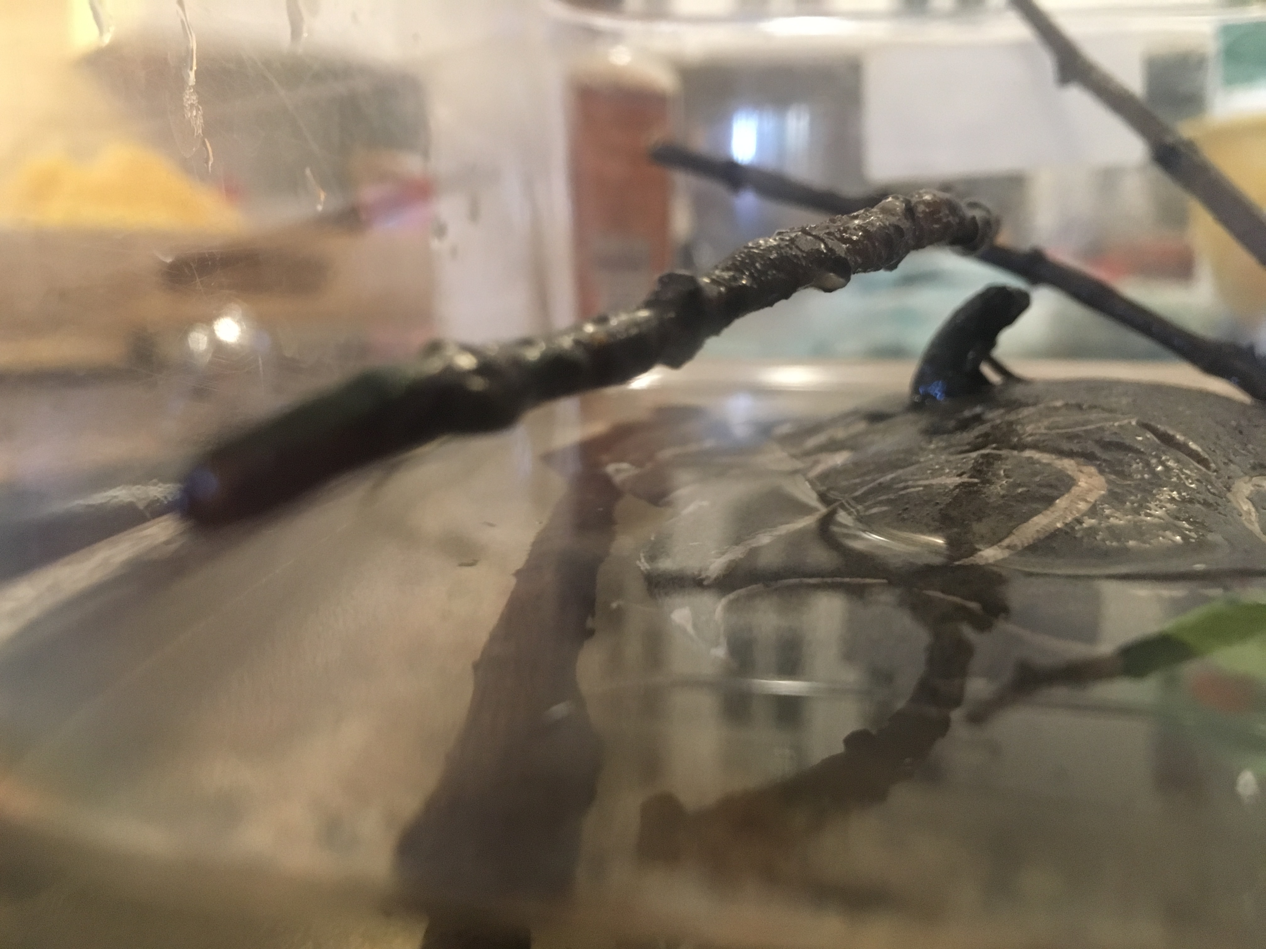 I swear he was way happier with the additions. (Go ahead and laugh. I don’t care.) Lethargy forgotten, he careened around his enclosure, now with far less water, dodging between twigs and hiding by the rock’s sloping sides. He did swim right up to the rock to rest in the water while he breathed. I was delighted, and I think that’s when I lost a little piece of my heart to him.